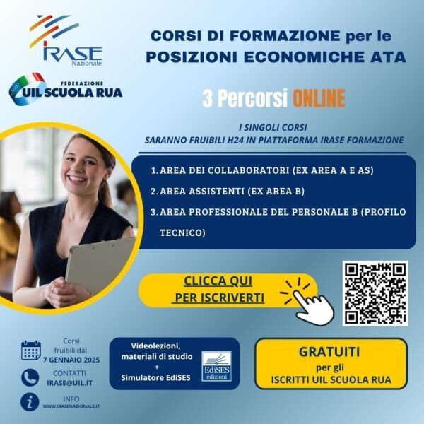 Disponibili i corsi di preparazione alle procedure concorsuali per l’accesso alle POSIZIONI ECONOMICHE ATA. I corsi sono organizzati da Uil Scuola Rua e IRASE Nazionale. In questa pagina gli interessati potranno trovare tutte le informazioni su condizioni e modalità di iscrizione.